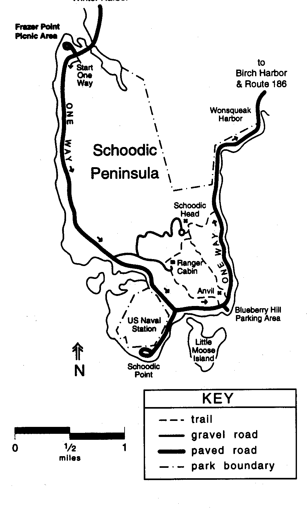 The byway starts on Route 1 at the Hancock-Sullivan Bridge and follows Route 1 to the intersection with Route 186 or Jones Cove in West Gouldsboro. The byway then follows Route 186 through Winter Harbor taking a right turn onto Moore Road which becomes Schoodic Road through the Schoodic portion of Acadia National Park. Schoodic Road returns to Route 186 in Birch Harbor and continues on to Prospect Harbor.